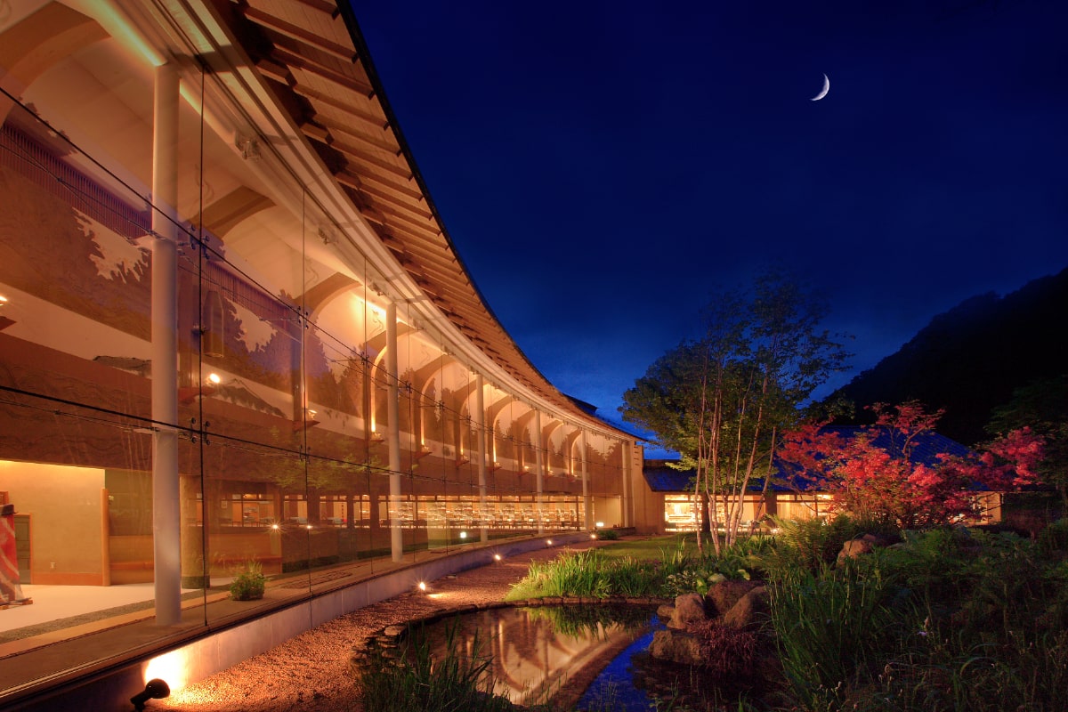 現代建築と日本の伝統的な建築手法・素材を、館内各所に取り入れており、開放感あふれる高さ約8mものガラス張りの曲面廊下などの現代建築や、組子障子や雲母刷り(きらずり)の和紙が美しい照明などの伝統技術の融合が体感できます。