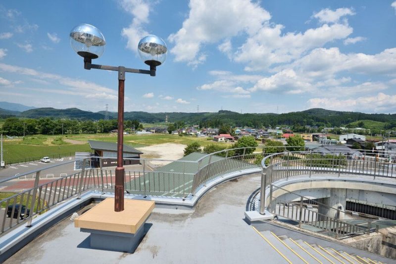 宮城県 あ・ら・伊達な道の駅の屋上展望台は、施設の特徴の一つです。展望台へは、スパイラルホールかららせん状のスロープを上っていきます。このスロープの壁面には、様々な展示物が設置されており、上りながら楽しむことができます。