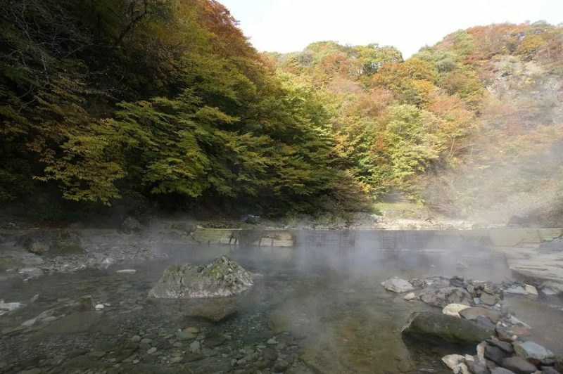 尻焼温泉「川の湯」は、群馬県吾妻郡中之条町の長笹沢川の川底から湧き出る天然温泉を堰き止めて作られた、自然そのままの巨大な露天風呂です。約30メートル四方の広さを誇り、24時間無料で利用可能です。泉質はカルシウム・ナトリウム-硫酸塩・塩化物泉で、神経痛や皮膚病、痔疾などに効果があるとされています。川底の石に腰掛けて入浴すると痔が治ったという伝承から「尻焼」の名が付いたとされています。自然の川を利用した温泉のため、天候や水量により入浴できない場合があります。更衣室はなく、混浴となるため水着の着用が推奨されています。秋には紅葉を眺めながらの入浴が楽しめ、秘湯ファンに人気のスポットです。